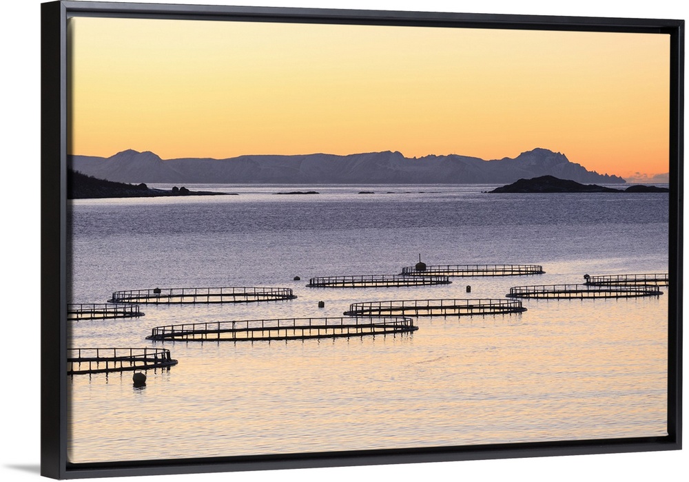 <p>Sunset lights up the fish tanks of codfish and salmon in the cold sea of Torsken, Senja, Troms, Norway, Scandinavia, Europe</p>