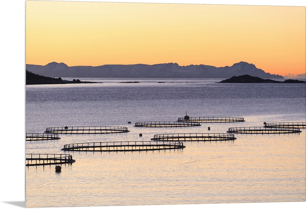 <p>Sunset lights up the fish tanks of codfish and salmon in the cold sea of Torsken, Senja, Troms, Norway, Scandinavia, Europe</p>