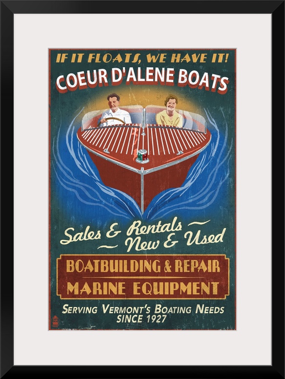 <p>Retro stylized art poster of a couple driving a speed wooden boat.</p>