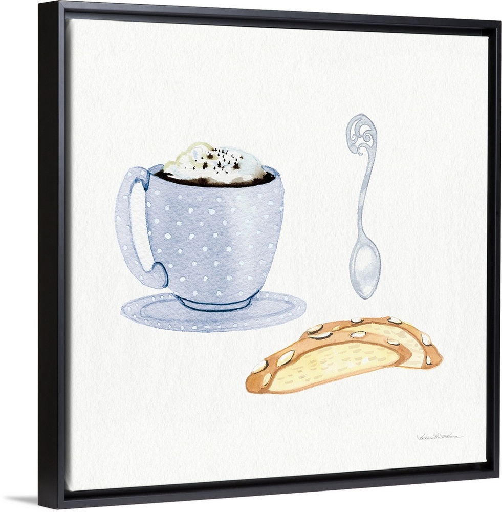 <p>Square watercolor painting of a blue and white polka dot coffee cup with biscotti and a spoon on a white background.</p>