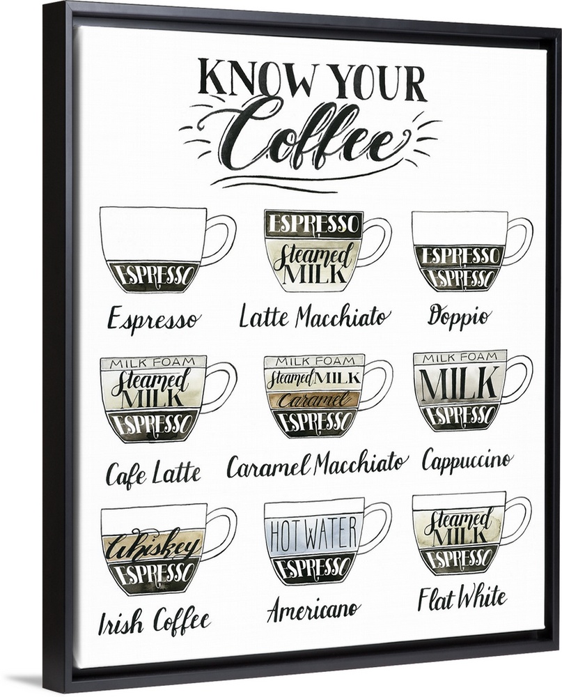 <p>Illustrated kitchen sign titled 'Know Your Coffee' with different types of coffee and the ingredients that goes in each one.</p>