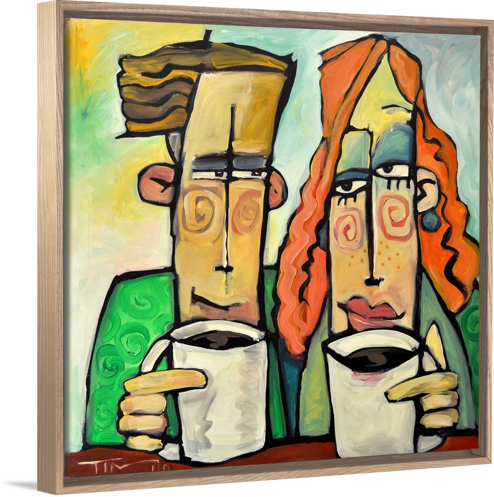 <p>Square painting of two cartoon like figures enjoying mugs of coffee.</p>