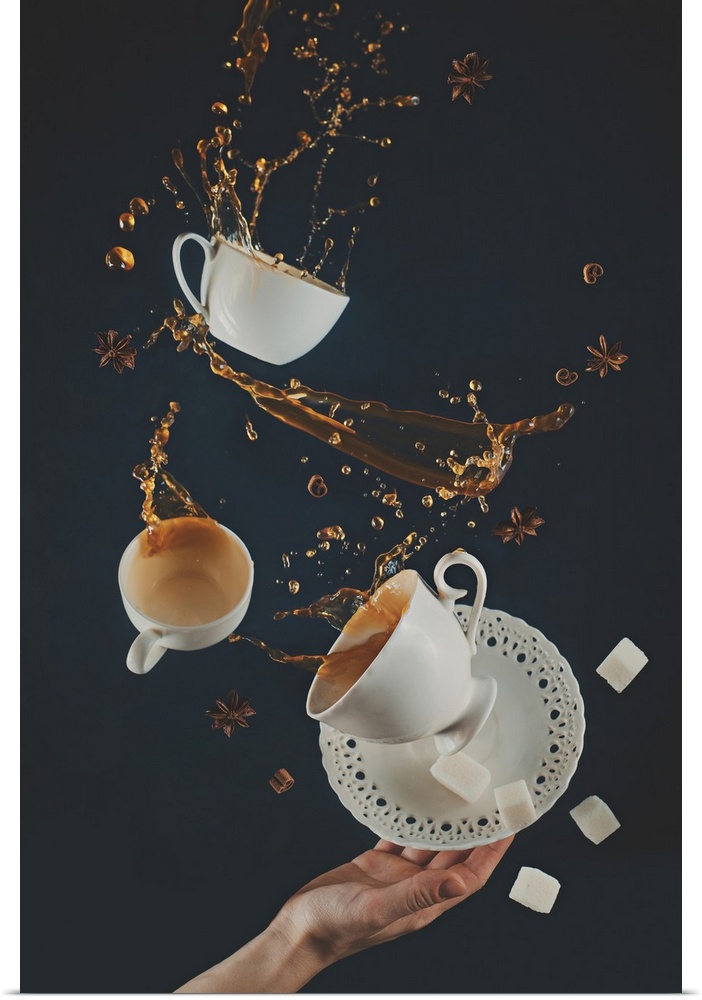 <p>Flying coffee cups with saucer, dynamic splashes and falling sugar cubes on a black background.</p>
