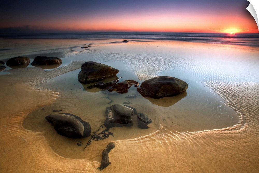<p>Smooth rocks in low tide on Rainbow Beach, Queensland, Australia.</p>