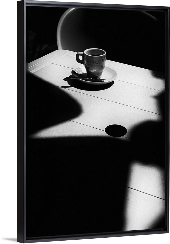 <p>A small coffee cup and saucer sitting on an empty table covered in dark shadows.</p>