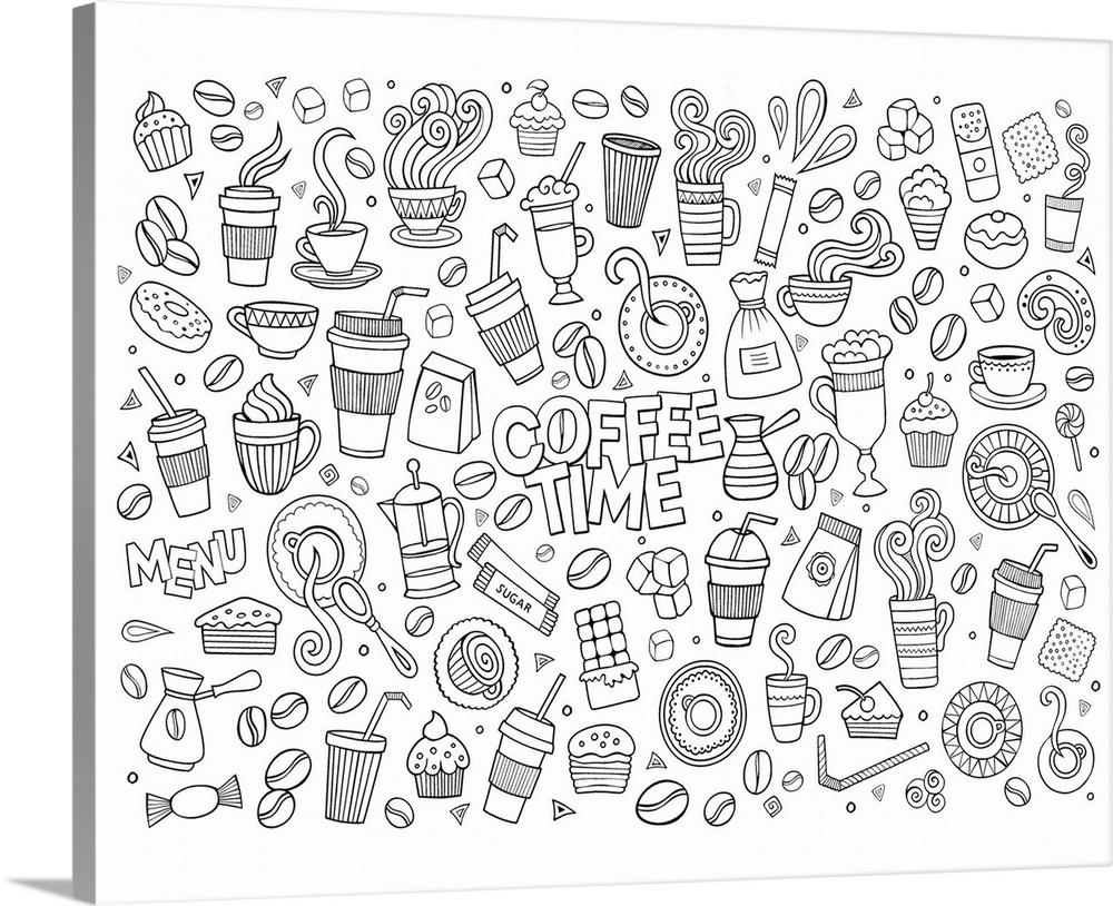 <p>A collection of coffee-themed objects such as mugs and beans, surrounding the words "Coffee Time." Perfect for coloring canvas.</p>