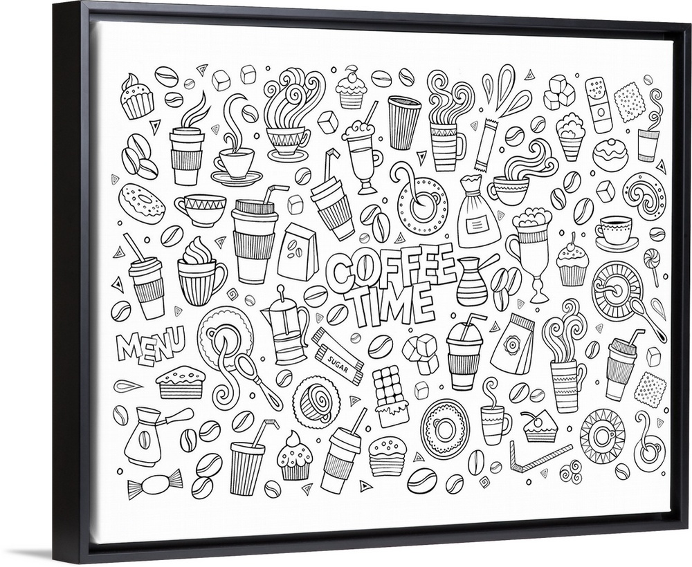 <p>A collection of coffee-themed objects such as mugs and beans, surrounding the words "Coffee Time." Perfect for coloring canvas.</p>