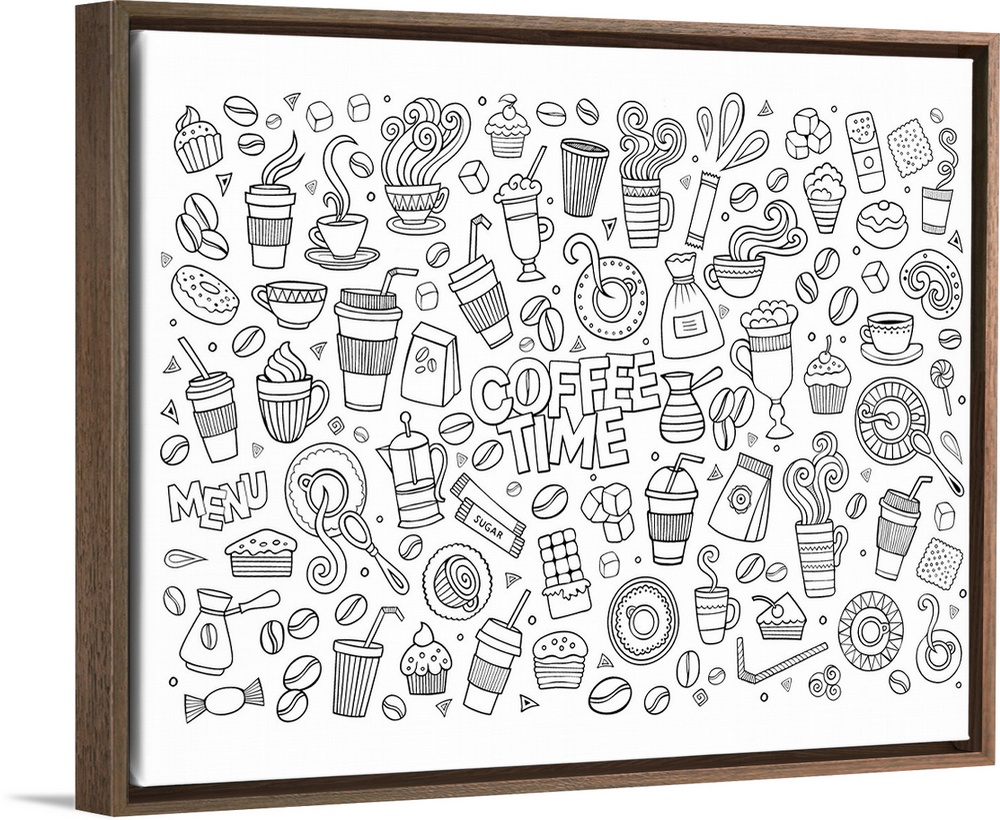 <p>A collection of coffee-themed objects such as mugs and beans, surrounding the words "Coffee Time." Perfect for coloring canvas.</p>