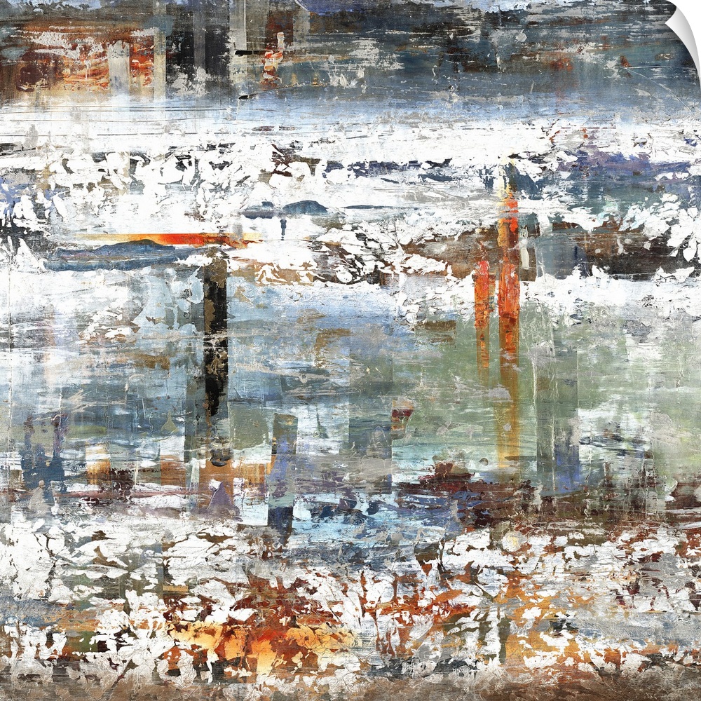<p>Square abstract art with a balance of both cool and warm tones and thick, white, choppy bands running horizontally across the canvas.</p>