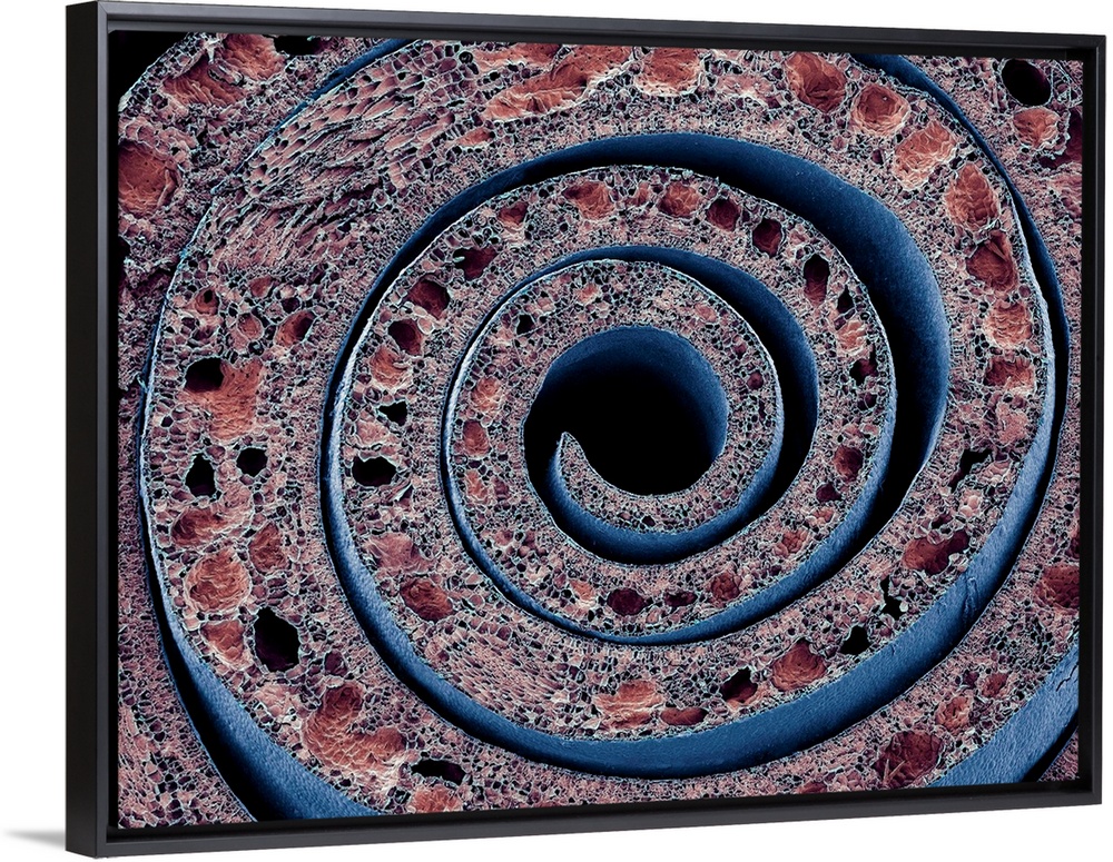 <p>Lily leaf. Coloured scanning electron micrograph (SEM) of a freeze-fractured section of a coiled lily leaf. The plant cells can be seen as rectangular shapes inside the leaf. They contain chlorophyll, the green pigment used to convert sunlight into energy during photosynthesis.</p>