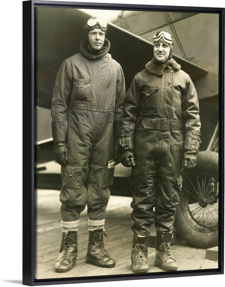 <p>Col. Charles A. Lindbergh (left) and Harry F. Guggenheim in flight-suits. Dec. 8, 1928. The aviation pioneers took off from the East River, NYC, for a Virginia hunting party as the guests of Governor Harry Byrd.</p>