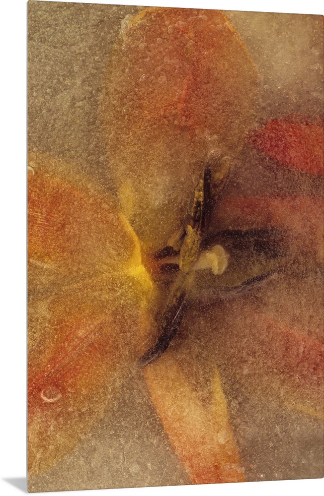 <p>Red and yellow tulip flowerhead lying open but trapped in sheet of ice</p>