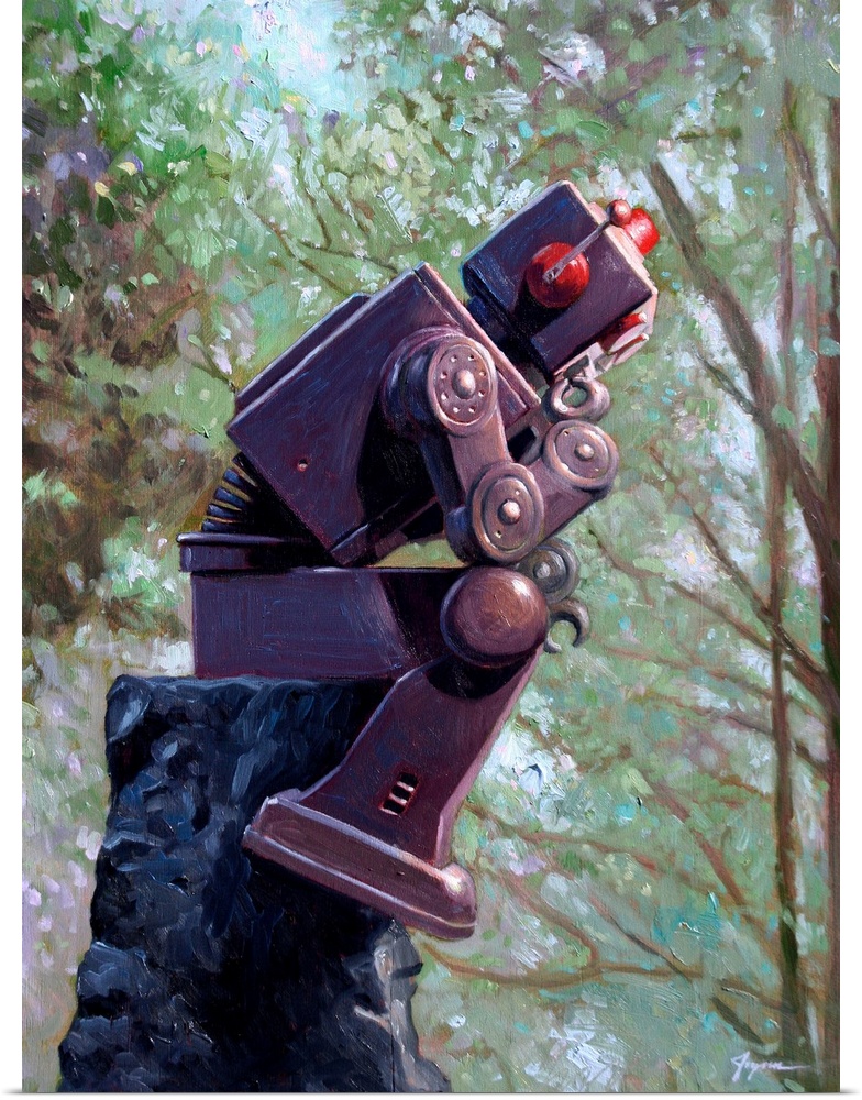 <p>A contemporary painting of a dark gray retro toy robot sitting on a rock pedestal in the iconic thinking positioning.</p>