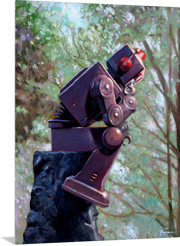 <p>A contemporary painting of a dark gray retro toy robot sitting on a rock pedestal in the iconic thinking positioning.</p>