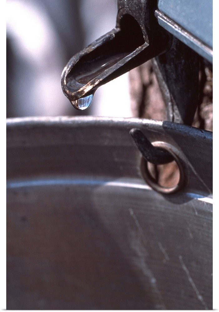 <p>Maple sap collection. Spout on a sugar maple tree (Acer saccharum) dripping sap into a can for maple syrup production. The sap is reduced (boiled down) to concentrate its sugar content, forming a sweet syrup used widely in desserts and sweets. Photographed in the Bruces Mill Conservation Area, Ontario, Canada.</p>