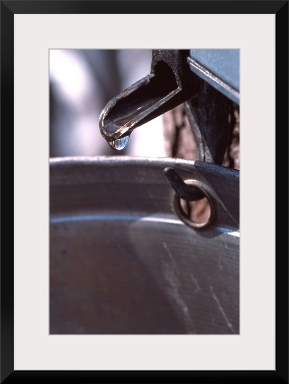 <p>Maple sap collection. Spout on a sugar maple tree (Acer saccharum) dripping sap into a can for maple syrup production. The sap is reduced (boiled down) to concentrate its sugar content, forming a sweet syrup used widely in desserts and sweets. Photographed in the Bruces Mill Conservation Area, Ontario, Canada.</p>