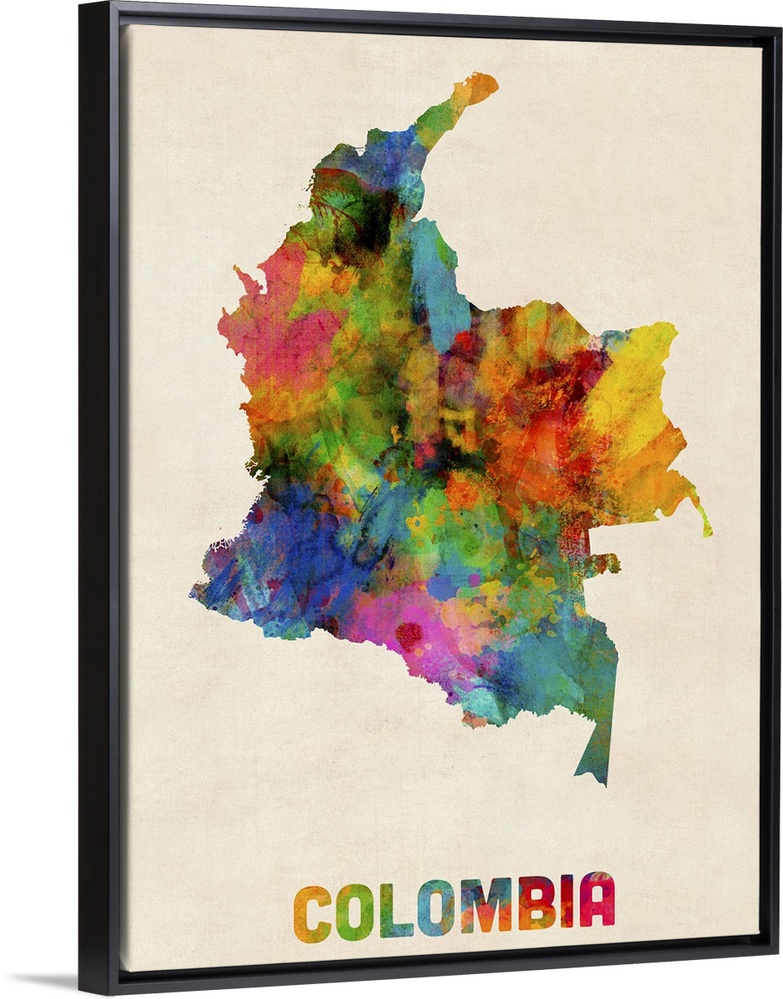 <p>Contemporary piece of artwork of a map of Colombia made up of watercolor splashes.</p>