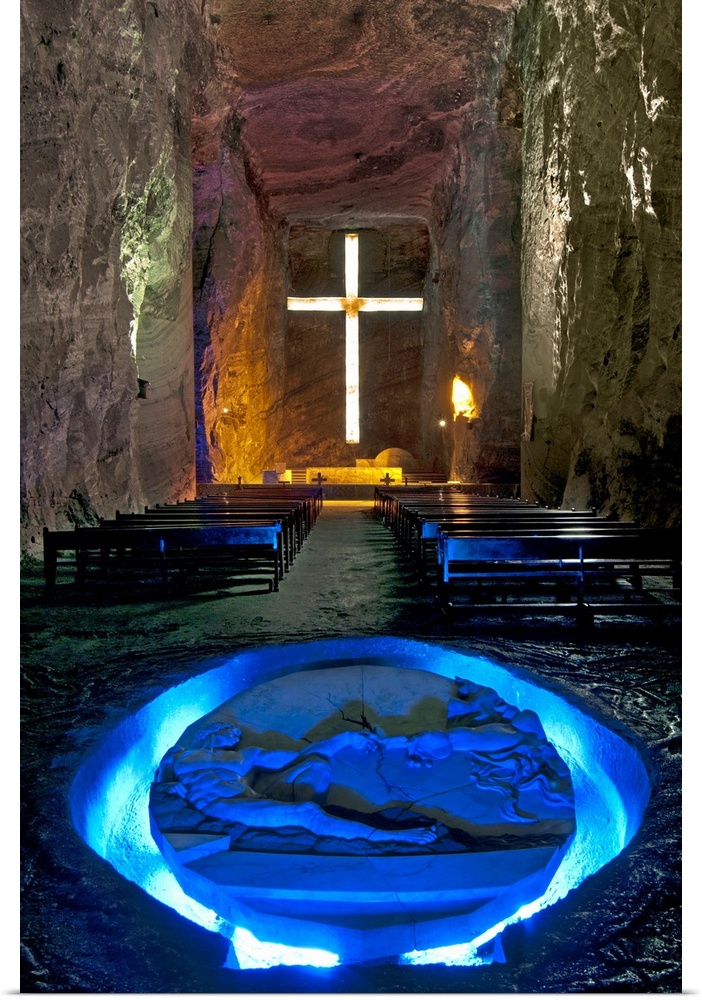 <p>Colombia / Zipaquira / Cudinamarca Province / Salt Cathedral / Main Altar With Cross / The Creation Of Man.Sculpture / Salt Mine</p>