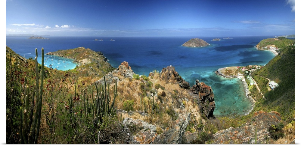 <p>180 view of the northwest coast of St Barthelemy island, French West Indies, taken from the viewpoint at the end of the road and beginning of the footpath to Colombier bay mid afternoon.</p>