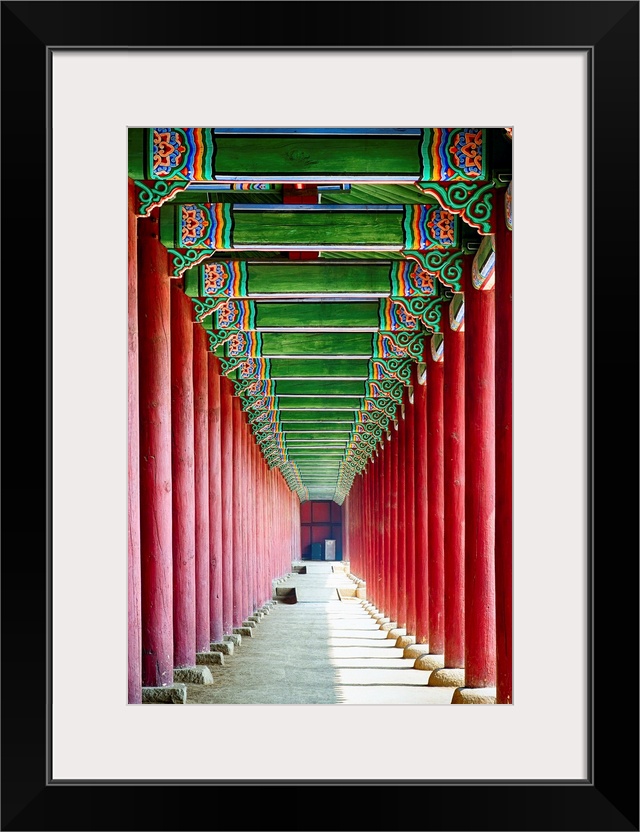 <p>Looking down through the bright red columns of a royal building in South Korea.</p>