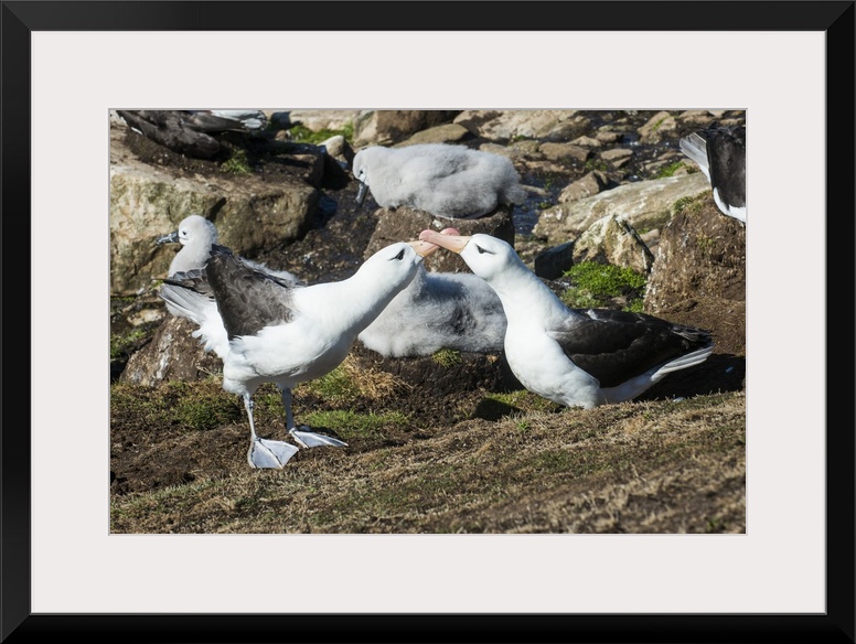 <p>Colony of black-browed albatross mother feeding a chick (Thalassarche melanophris), Saunders Island, Falklands, South America</p>