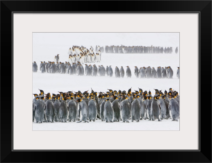 <p>Colony of King Penguins (Aptenodytes patagonicus) standing in groups and lined up on the wintry tundra with blowing snow, South Georgia Island, South Georgia, Antarctica</p>
