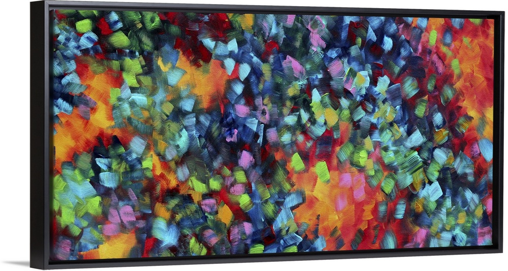 <p>Abstract artwork that has lots of bright colors painted in tiny squares and grouped together by warm and cooler tones.</p>