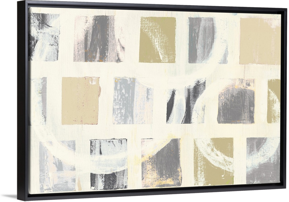 <p>Neutral colored abstract artwork with squares on an off-white background with large off-white circles on top.</p>