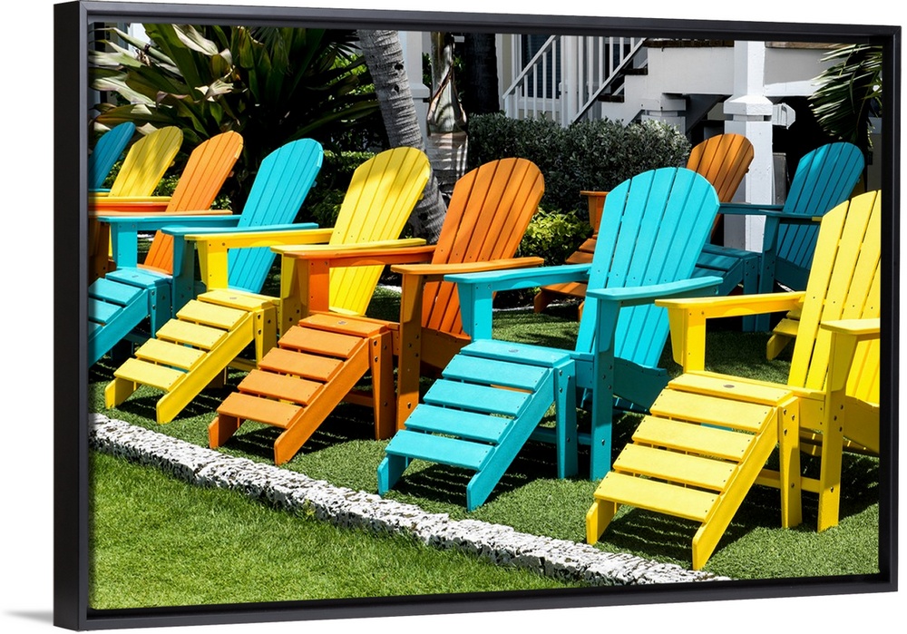 <p>A collection of brightly painted Adirondack chairs.</p>