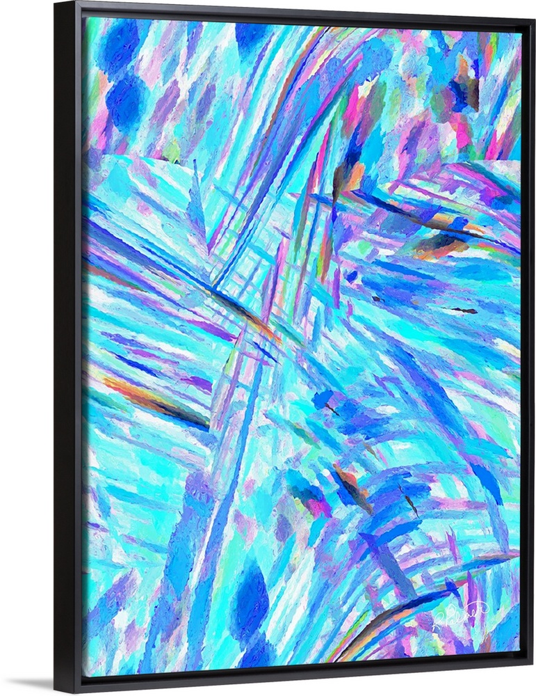 <p>A vertical abstract design in vibrant colors of blue, pink and orange.</p>