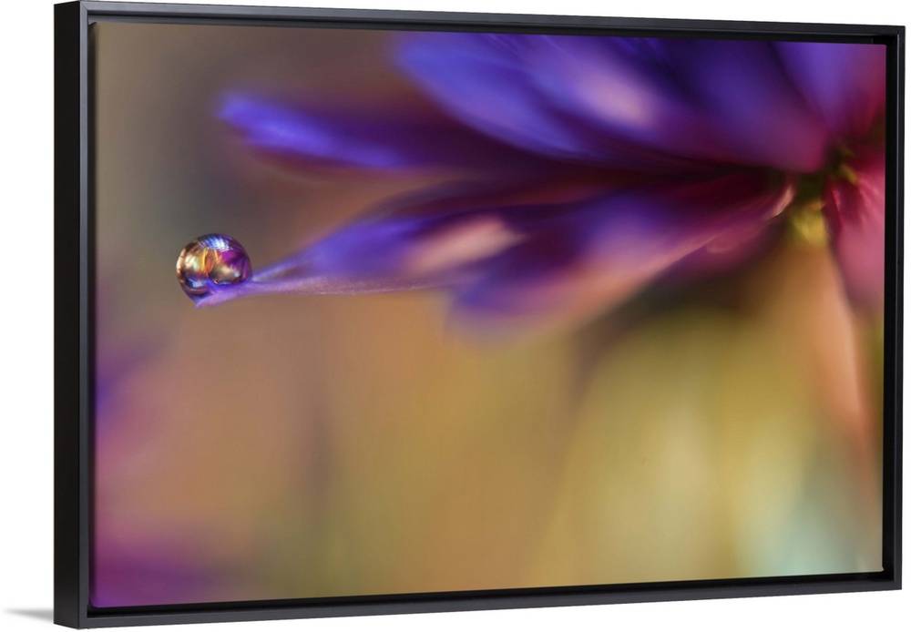 <p>A macro photograph of a water droplet sitting on the edge of a purple flower.</p>