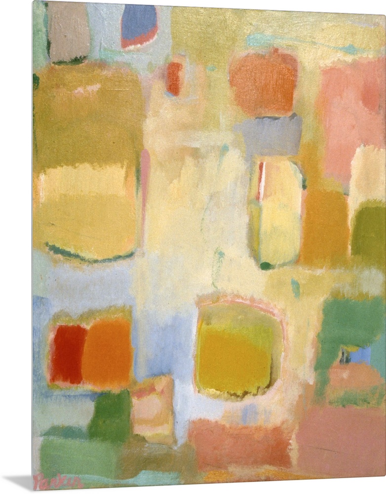 <p>Abstract painting of soft, rounded rectangular shapes in muted, spring-like colors</p>