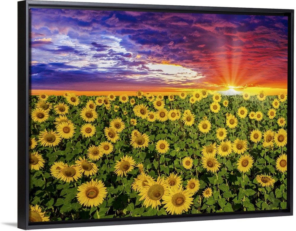 <p>In Tuscany the sunflower season is very beautiful, there are endless expanses of sunflower fields, it is a unique spectacle. This photo was taken in front of a group of giant sunflowers that were over two meters tall. I used a wide angle to get the scene I wanted. An incredible sunset make the shot very interesting.</p>