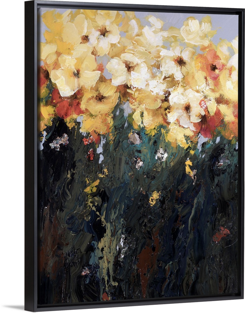 <p>This is a contemporary painting of flowers created with a heavy application of paint that creates a muddy mix of texture to represent the stems and grass the blossoms are growing among.</p>