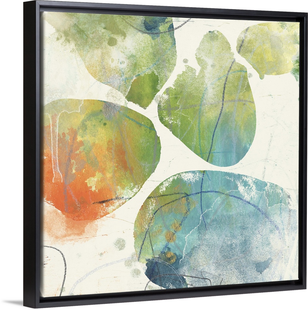 <p>Contemporary abstract painting of organic shapes in multiple colors against a neutral background.</p>