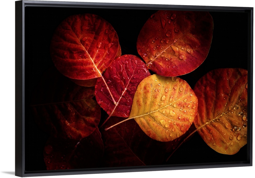 <p>Fine art photograph of a group of autumn leaves in moody lighting with dew drops.</p>
