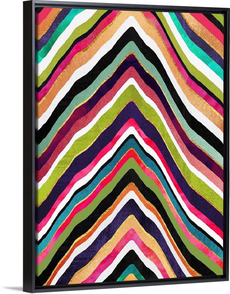 <p>Organically wavy chevron shapes in bold citrus and jewel tones outlined in gold.</p>