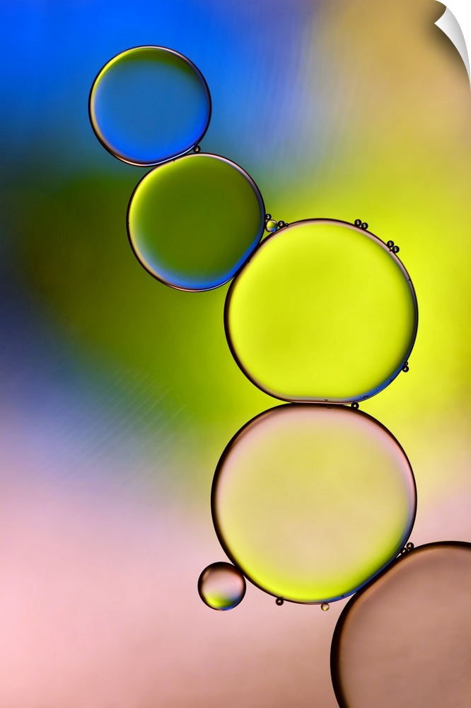 <p>A stack of large water droplets with tiny droplets on top of them with green, yellow, blue, and pale pink hues.</p>