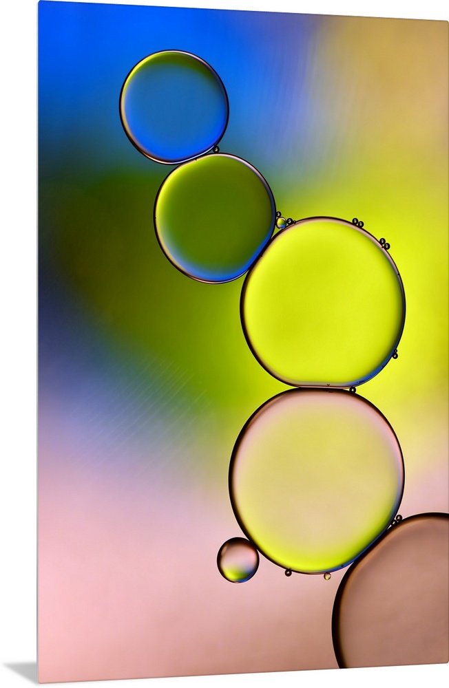 <p>A stack of large water droplets with tiny droplets on top of them with green, yellow, blue, and pale pink hues.</p>