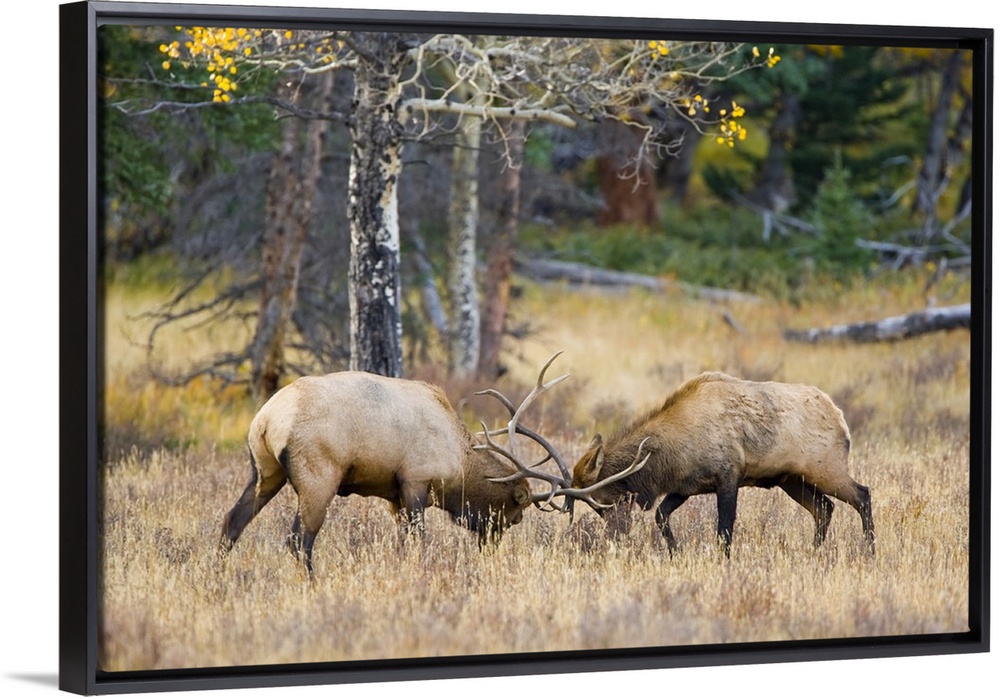 <p>USA, Colorado, Rocky Mountain National Park, Moraine Valley. Bull elks sparring for dominance in mating season.</p>