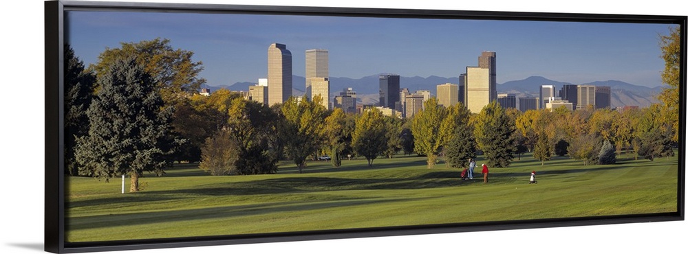 <p>Big, panoramic photograph on the green of a golf course in Colorado, full of trees, the buildings of the Denver skyline in the background.</p>