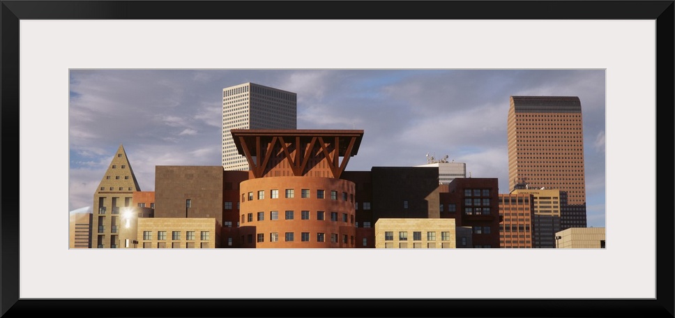 <p>Big, horizontal, close up photograph of the tops of skyscrapers in Denver, Colorado, against a mostly cloudy sky.</p>