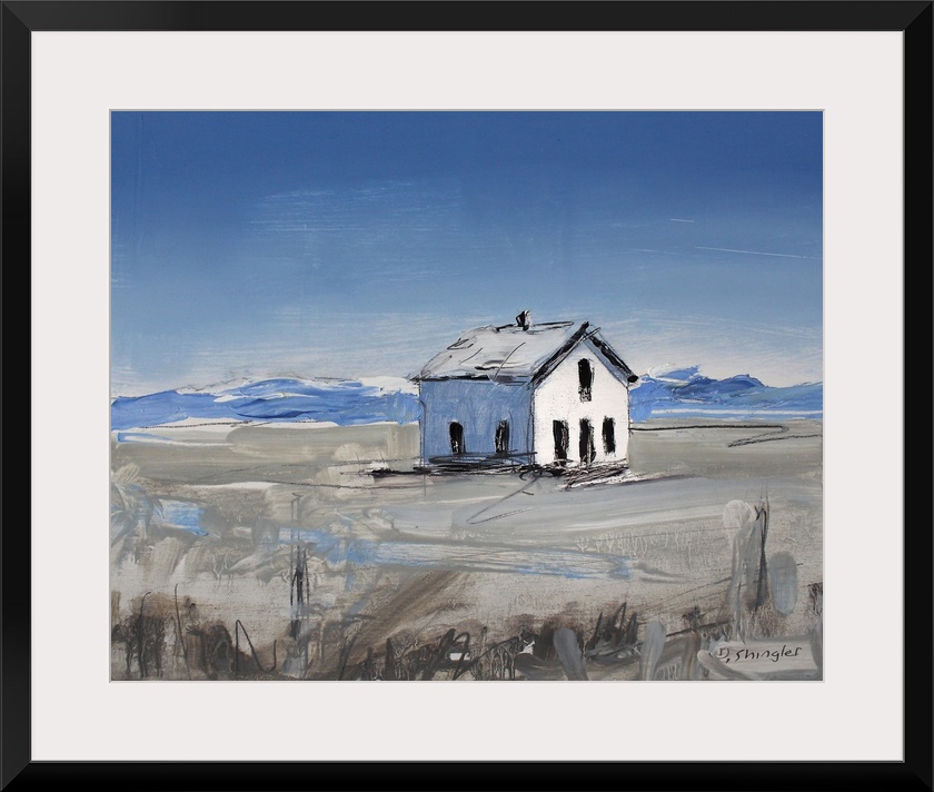 <p>Contemporary painting of a white house in a field, under a blue sky.</p>