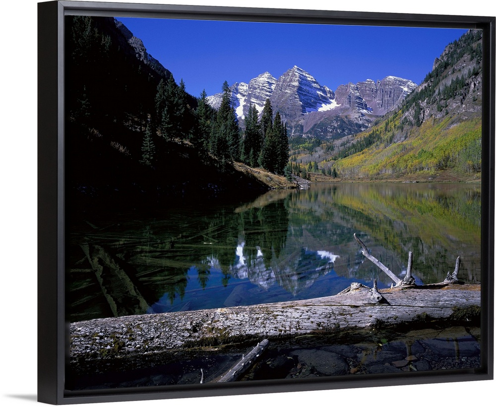 <p>Giant photograph of Maroon Bells, Colorado (CO) on a sunny day with a fallen tree trunk and lake in the foreground with an evergreen forest and looming mountains in the background.</p>