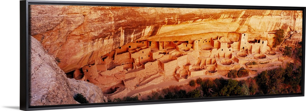 <p>This panoramic vista looks down into the cliff dwellings of the ancient Pueblo people as the stones are illuminated by the warm glow of a sunset.</p>