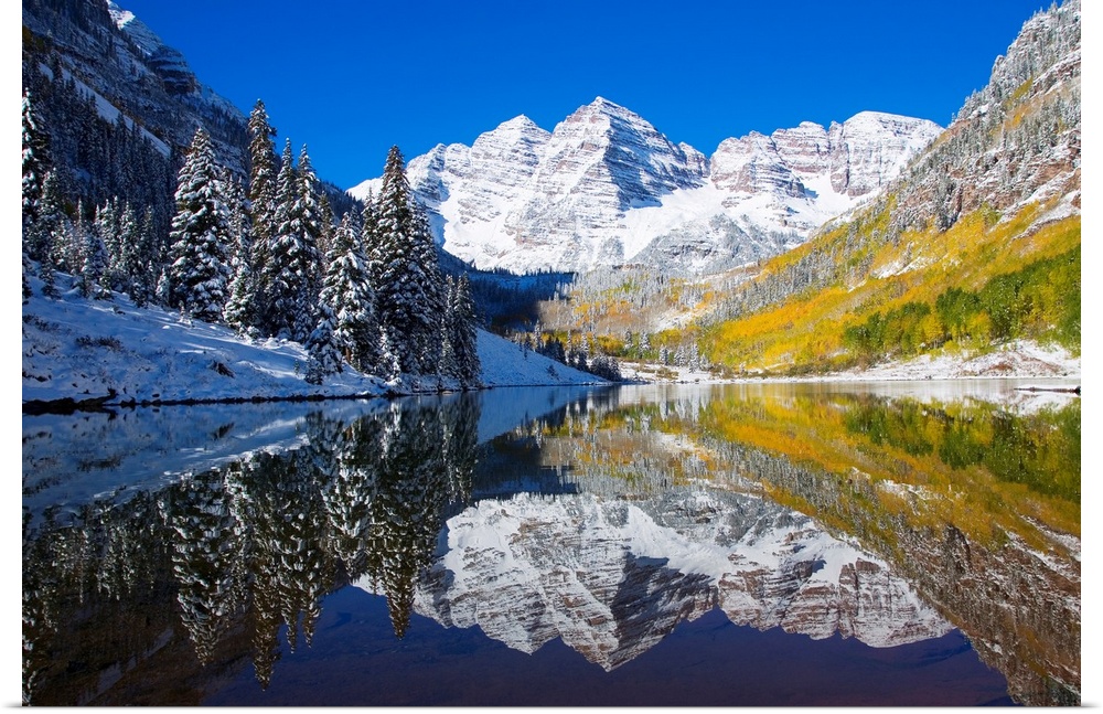<p>A snow covered mountain range with tall trees in front reflects beautifully into a body of water.</p>