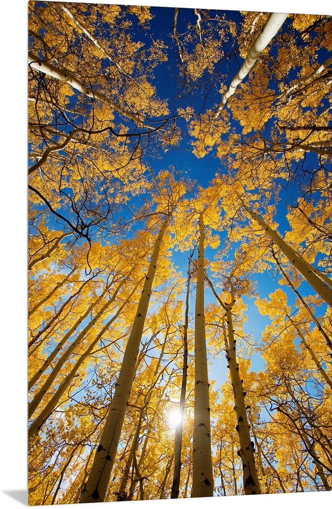 <p>Vertical photo on canvas of the view of the tops of aspen trees in a forest.</p>