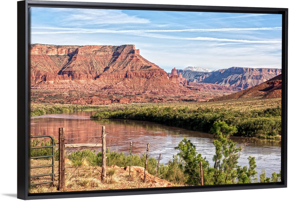 <p>The Colorado river running past the sandstone cliffs of the Red Rock Canyon, Arches National Park, Utah.</p>