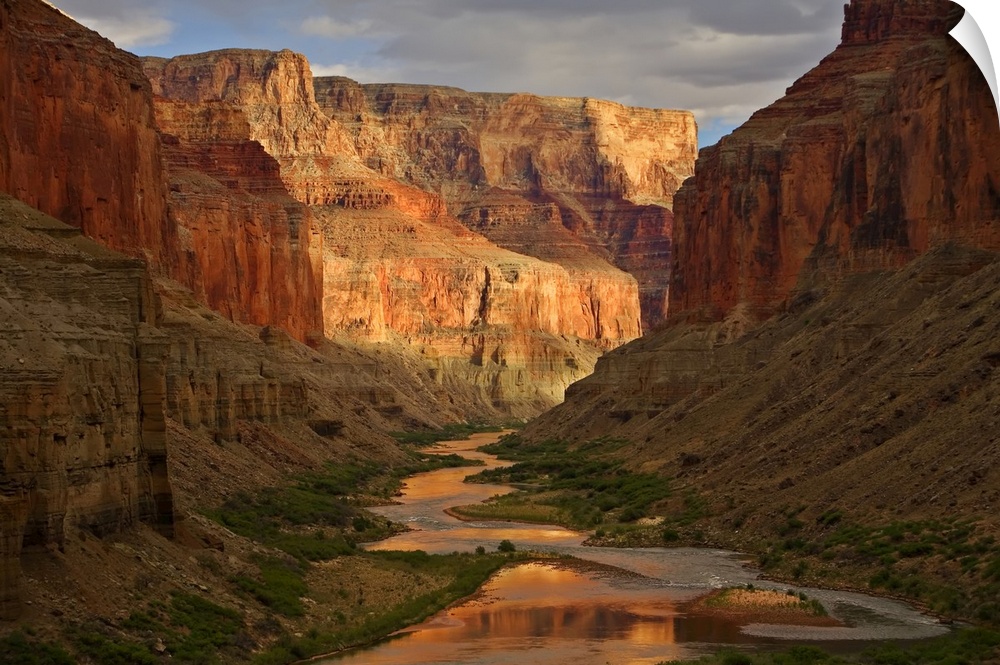<p>Large wall art of a river winding through the bottom of the Grand Canyon while the sides of the canyons cast shadows in the foreground and the sun highlights the background.</p>