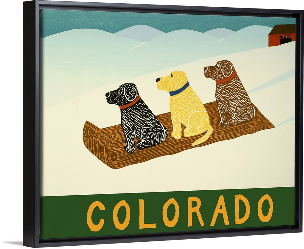 <p>Illustration of three Labradors sledding down the slopes in Colorado.</p>